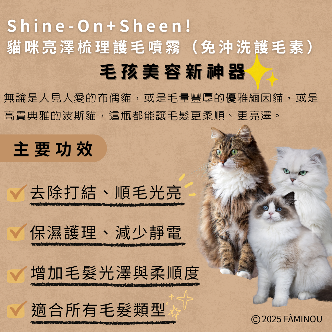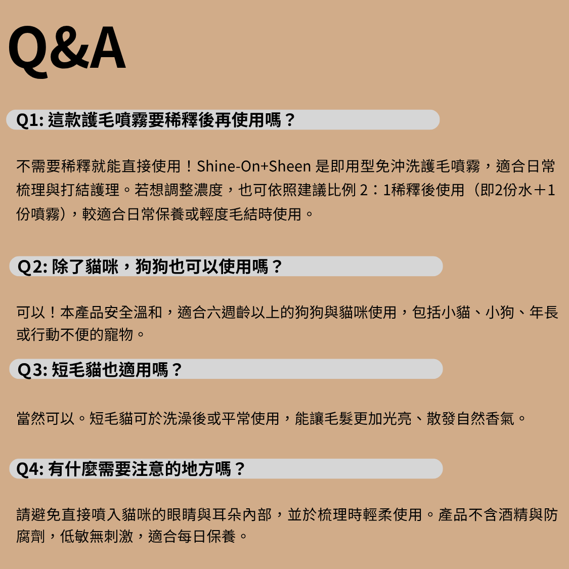 Shine-On+Sheen 亮澤護毛噴霧,輕鬆噴灑去除打結、減少靜電並縮短吹乾時間。