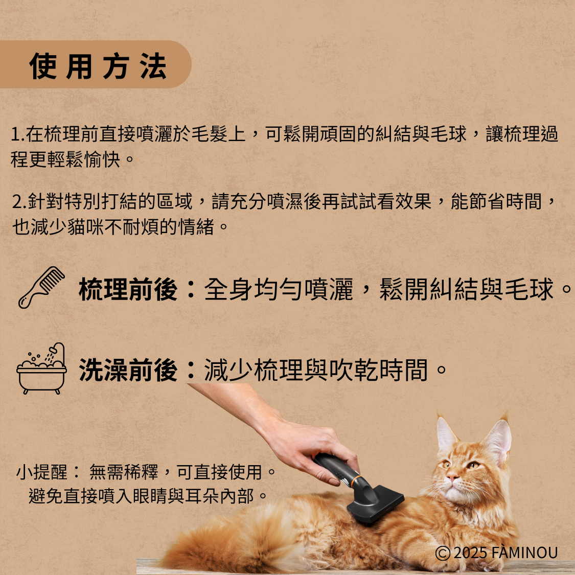 使用方式:梳理前後均可噴灑,全身均勻噴上後再梳理,避免眼耳部位。